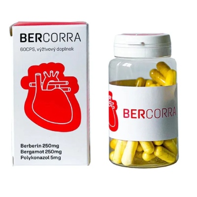 Posvietiť by sme si mali aj na doplnok stravy Bercorra, celkovo obsahuje 3 aktívne látky: Berberín, Naringín a Polikozanol. Nie je to zlé, ale predstavovali by sme si viac účinných látok, pretože cena je pomerne vysoká (pohybuje sa okolo 22 eur). Balenie obsahuje 60 kapsúl, užívajú sa 2 kapsuly denne.